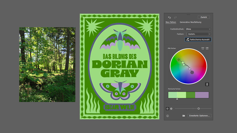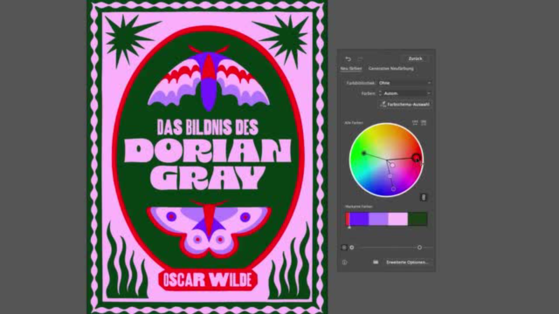 Mit der Funktion „Neu färben“ kannst du im Handumdrehen neue Farbkombinationen für deine Designs, Illustrationen oder einzelne Ebenen und Objekte entdecken. Wähle eine Farbe im Farbkreis aus, ändere sie manuell – und die übrigen Farben passen sich automatisch an.