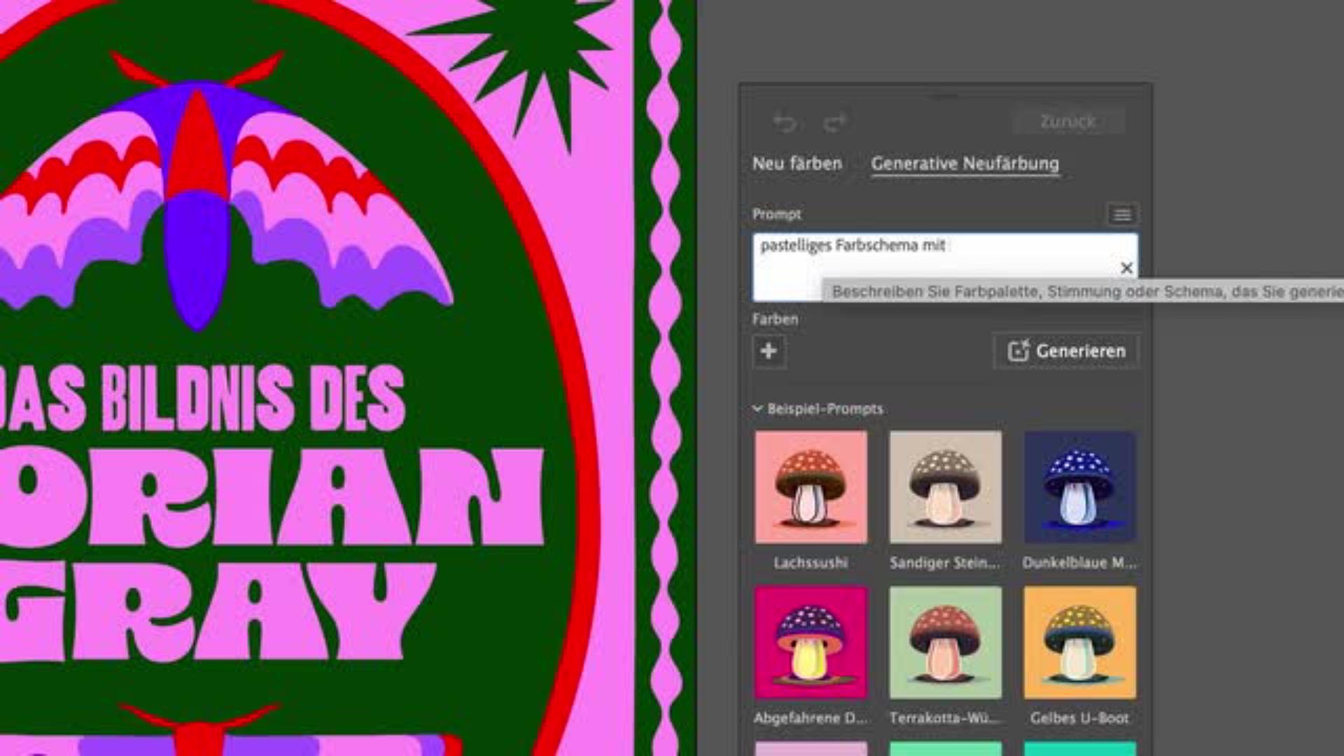 Mit dem KI-Tool „Generative Neufärbung“ kannst du Illustrationen mithilfe eines Prompts neu einfärben und dein Farbschema ändern. Beschreibe eine gewünschte Farbstimmung oder eine thematische Richtung, die die KI umsetzen soll.