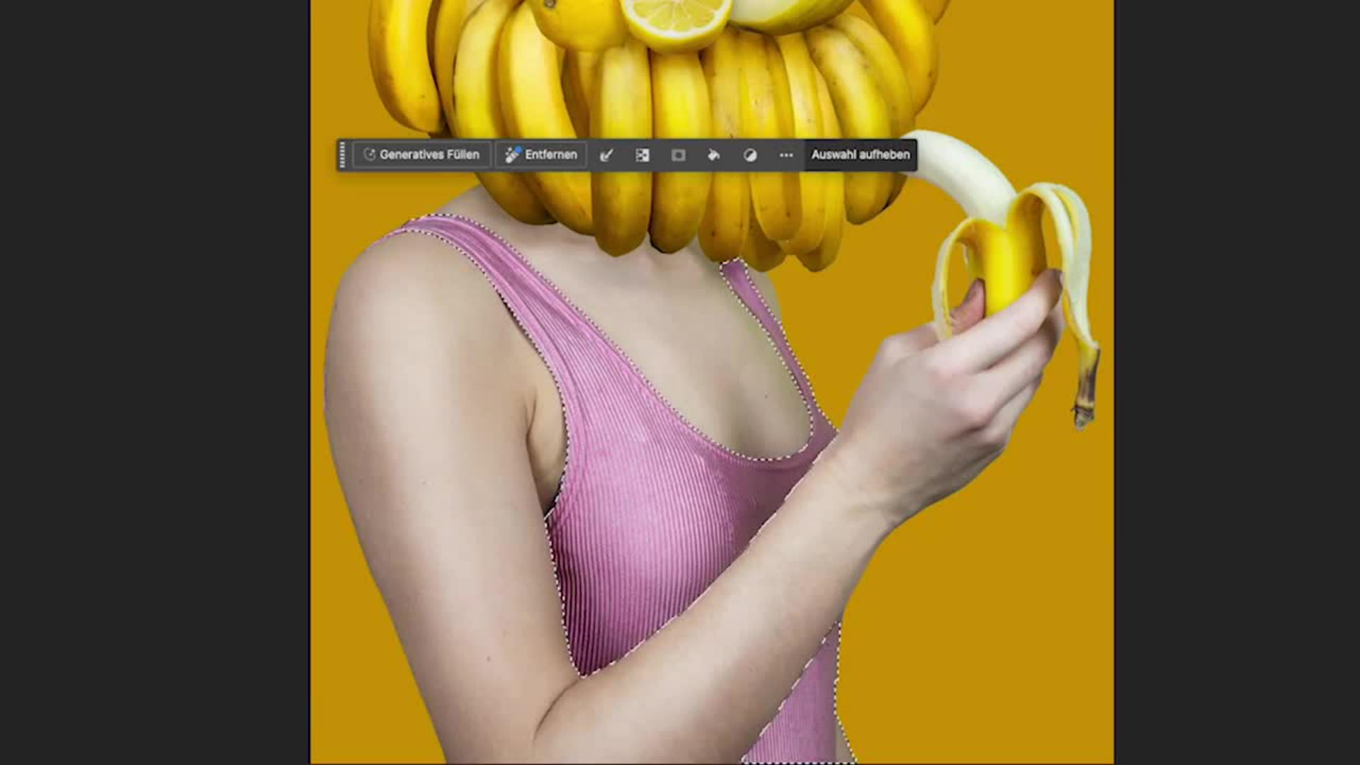 Wähle das Oberteil mit dem Schnellauswahl-Werkzeug aus. Über die Optionsleiste lässt sich die Toleranz einstellen, mit gedrückter Alt-Taste Bereiche von der Auswahl entfernen.