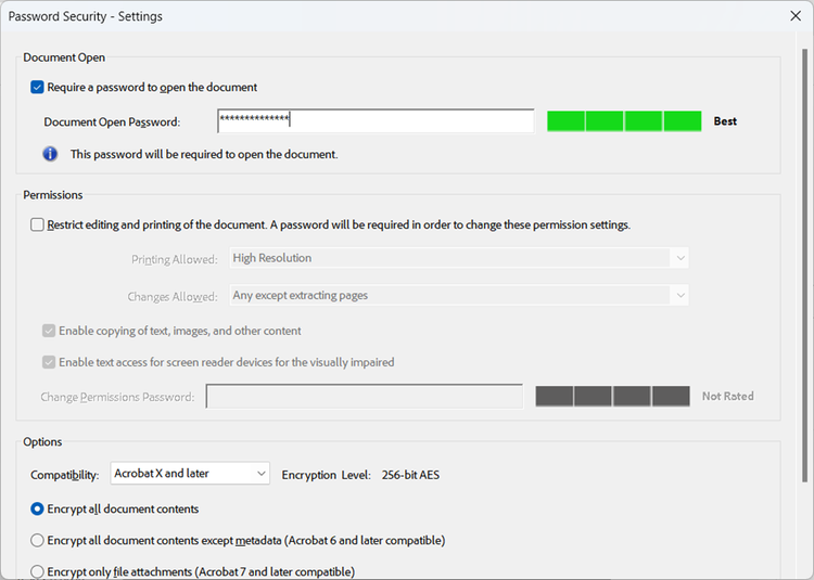 First, to understand password security, it’s important to be aware of the basics. There are two fundamental methods you can choose from to use passwords for protecting PDFs in Adobe Acrobat. One controls who can open and see your PDF files. The other restricts anyone else’s ability to edit, copy, and print your content.