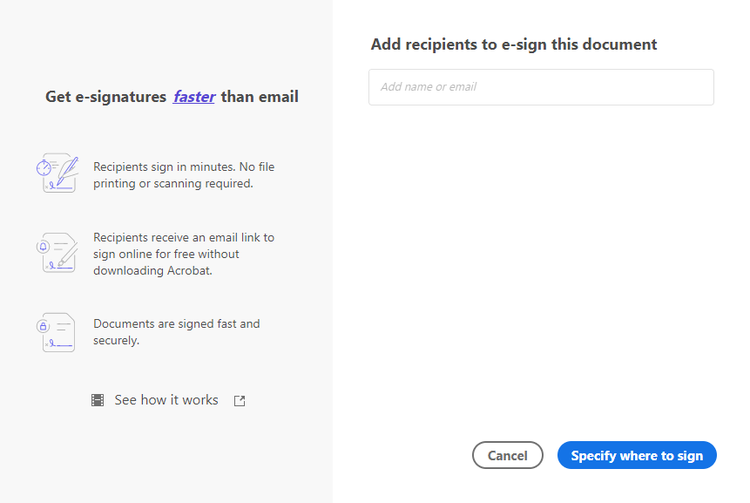 - When you click Specify where to sign, it’ll take you to the document to put fillable fields that the recipient can fill in with their name/signature/date and company etc.