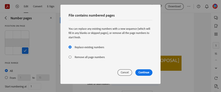To remove page numbering from a PDF using Adobe Acrobat Online, you will see the prompt below to remove or replace existing page numbers when you upload a PDF with existing page numbering.