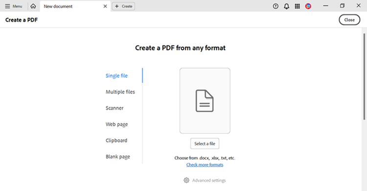 - Open Acrobat and create your file. Click on the + Create menu at the top of the screen to create a PDF from any format.