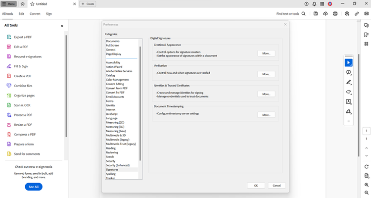 Set your preferences for digital signature creation, appearance, verification, identities, certificates, and timestamping. Just click on the Menu and scroll down to Preferences.