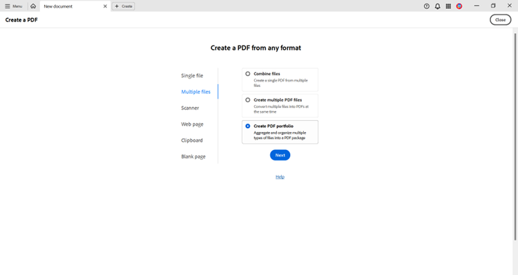 To organize multiple file types into different categories and folders, try the PDF portfolio feature. This document management feature acts like a storage container to group all your important documents.