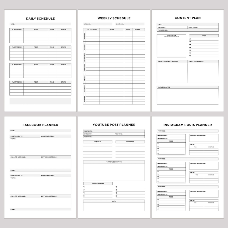 Social media plan workbooks and templates can in various formats. These include spreadsheets, word documents, calendars, and, of course, PDFs.