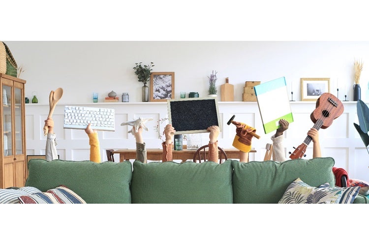 Photo of children's arms raised behind a couch and in front of a dining table. They children are holding up items such as a keyboard, chalkboard with Adobe written on it, wooden spoons, hammer, book, and musical instruments.