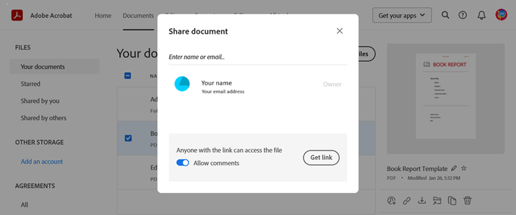 When you send PDFs for review with Adobe Acrobat, you can use the Adobe Document Cloud to store and share your PDF file with others safely and securely. If your reviewers don’t have any of the Adobe Acrobats downloaded and installed, they don’t need to. They’ll be able to review your PDF file in their browser.