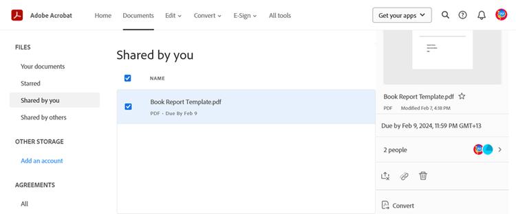 After you have shared your PDF file, in Adobe Acrobat online or in your Adobe Acrobat application, click on Documents > Shared by You. You’ll be able to see —