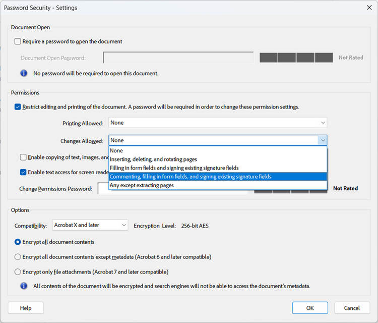 Using the Edit a PDF tool, you can choose settings to allow others to —