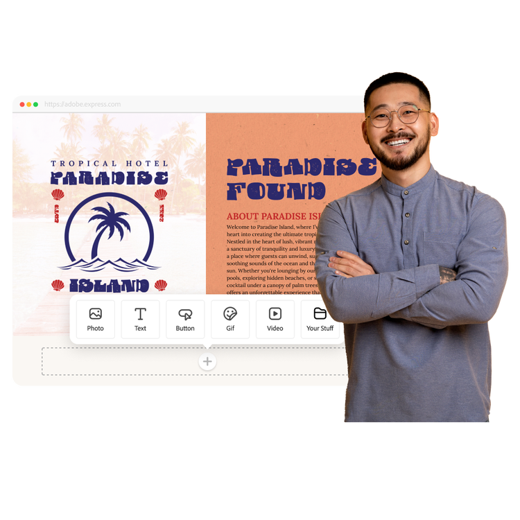 Enjoy the freedom of building a professional webpage exactly as you envision it, no design skills needed. Create your own webpage theme by selecting your favorite fonts, colors and more to apply across all your one-page websites made in Adobe Express for a consistent look and feel. Before going live, send collaborators an invite to co-edit your new webpage design via share link. If you want to control who has access to your webpage, you can also set up a password.