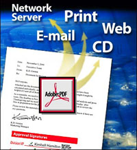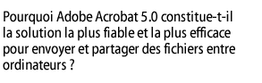 Mais de plus en plus, ce sont les petites et moyennes entreprises qui recherchent des solutions de communication plus rapides et moins chères. Et ce sont des entreprises telles que la vôtre qui choisissent Adobe Acrobat 5.0 pour améliorer leurs méthodes de travail et faire du transfert de documents une opération quotidienne : en effectuant dans Acrobat 5.0 tout ce que vous faites aujourd'hui sur papier.