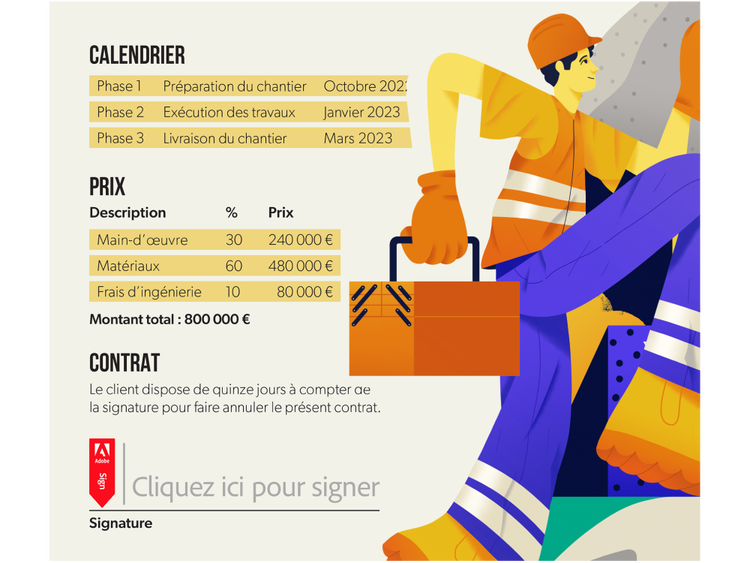 Appuyez-vous sur les nouvelles fonctionnalités de signature électronique d’Acrobat pour signer des documents et demander des signatures. Créez une bibliothèque de templates partagés contenant les fichiers que vous utilisez fréquemment, ajoutez votre logo, etc.