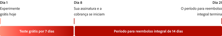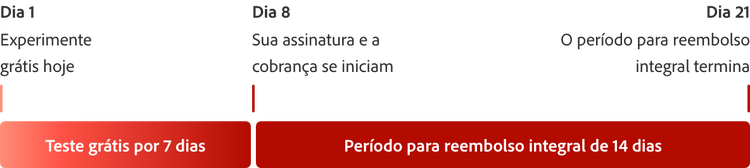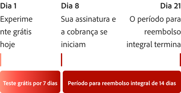 Teste grátis por 7 dias o Acrobat Studio. Se precisar de mais tempo para experimentar todos os recursos, você terá mais 14 dias para solicitar o cancelamento e receber o reembolso integral.