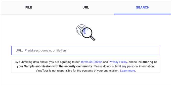 2. Selecione a guia para ARQUIVO, URL ou PESQUISA. A opção PESQUISA permite digitar um URL, endereço IP, domínio ou hash de arquivo.
