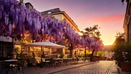 corner cafe in Paris completely covered in dripping wisteria with a dreamy pink gradient sunset