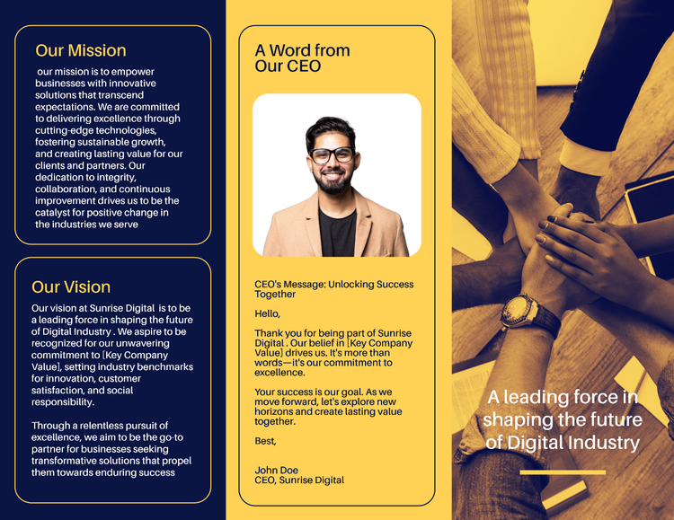 Promova seu negócio, marca, startup, empreendimento, proposta de projeto ou qualquer coisa próxima disso com um panfleto corporativo profissional, informativo e bem elaborado. Usando o fluxo de texto, você pode ajustar rápida e facilmente o tamanho de uma caixa de texto e fazer com que todo o seu texto flua para a próxima caixa, sem necessidade de ajustes ou formatações adicionais. Divida os parágrafos em várias colunas para seu panfleto ou use uma imagem para dividir seu texto em vários blocos para uma experiência de visualização envolvente.
