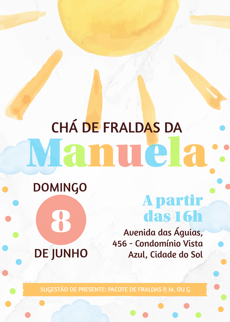O chá de bebê é uma oportunidade de presentear a futura mamãe com uma série de utensílios e mimos. É uma demonstração de apoio e a celebração daquela gravidez. Com certeza você vai querer começar esse evento tão especial da melhor maneira possível. Convide a todos utilizando os modelos encantadores de convites para chás de bebês do Adobe Express. A plataforma oferece um formato de passo a passo, com todos os elementos de design divididos de maneira simples. Você pode combinar os elementos gráficos para transmitir como será o clima do seu chá de bebê e fazer um convite incrível. Em seguida, é só compartilhar ou baixar sua arte.