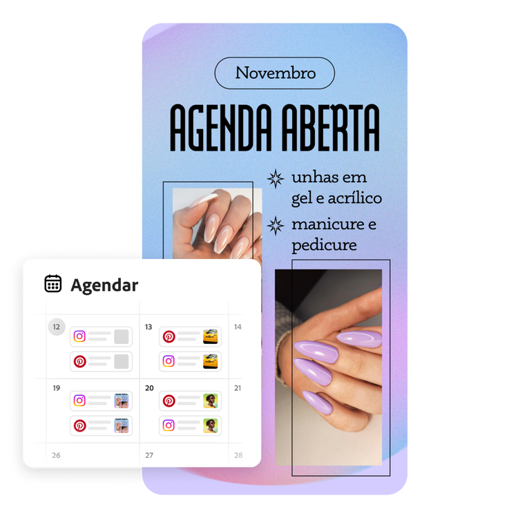 Planejando compartilhar sua nova colagem lado a lado nas redes sociais? Abra sua colagem no editor completo do Adobe Express para acessar o Agendador de conteúdo integrado. Agende dias, semanas e meses com antecedência e publique quantas publicações quiser em qualquer rede social.