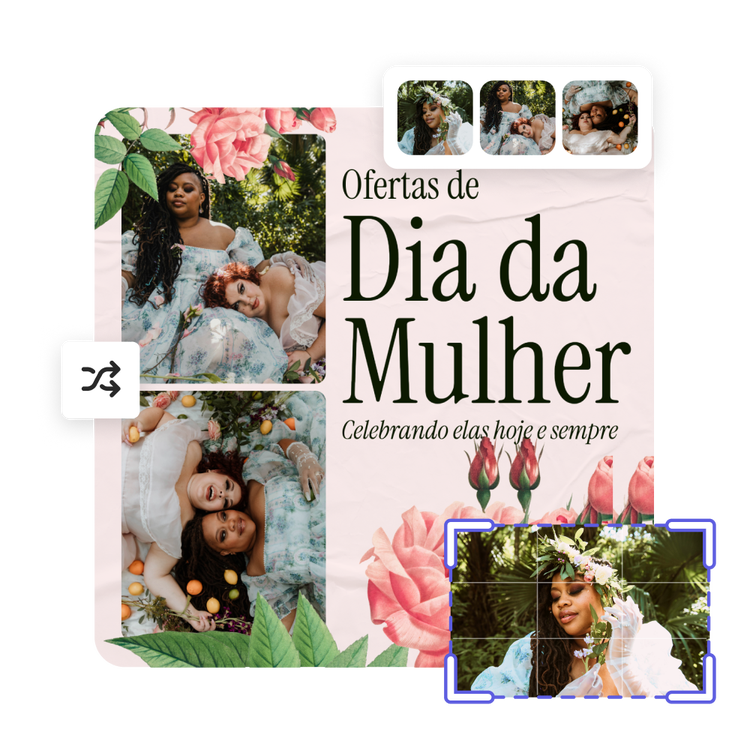 Não sabe em que ordem colocar suas fotos? Com o criador de colagens lado a lado, você pode facilmente arrastar e soltar suas fotos para reorganizá-las. Ou clique em Layout aleatório e observe como a ordem das fotos aparece em diferentes variações. Depois, corte as imagens perfeitamente para que caibam em cada grade exatamente como desejado.