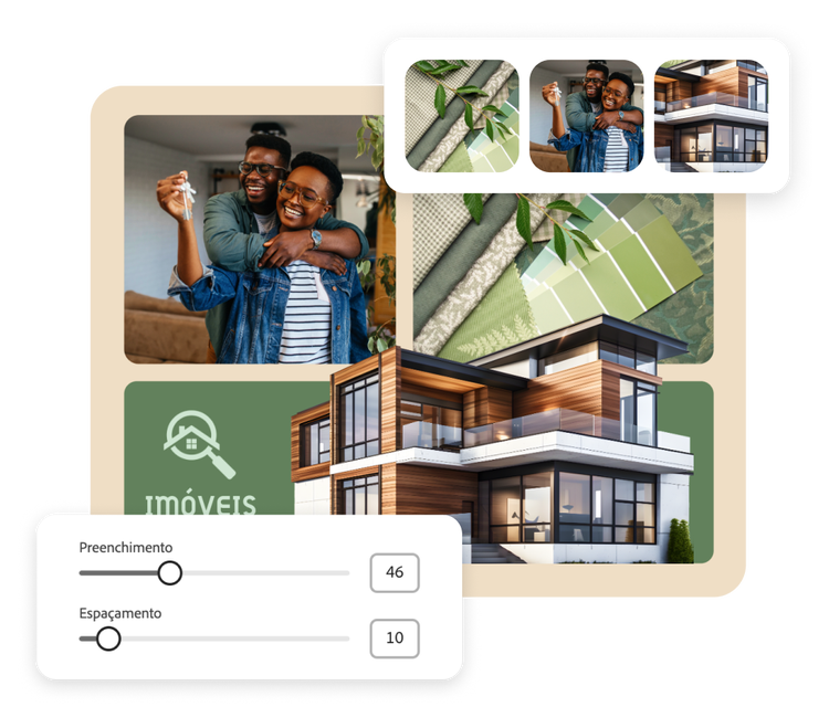 Crie facilmente colagens lado a lado impressionantes com o Adobe Express. Faça upload de um lote de imagens de uma só vez e observe o Adobe Express combiná-las em uma incrível colagem. Não importa se você está exibindo transformações de antes e depois ou destacando listagens de imóveis, o Adobe Express facilita a criação de colagens lado a lado impressionantes para as necessidades do seu negócio.