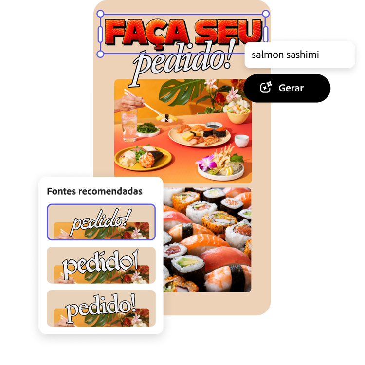 Personalize ainda mais sua nova colagem lado a lado usando o editor completo do Adobe Express e escolha entre uma variedade de fontes do Adobe Fonts para adicionar ao seu design. Caso esteja em dúvida sobre qual fonte escolher, experimente as recomendações de fontes selecionadas ou use efeitos de texto para gerar estilos de fonte texturizados exclusivos, feitos especialmente para você. Digite uma solicitação simples para ver o que você deseja ganhar vida. Sua imaginação é o limite.