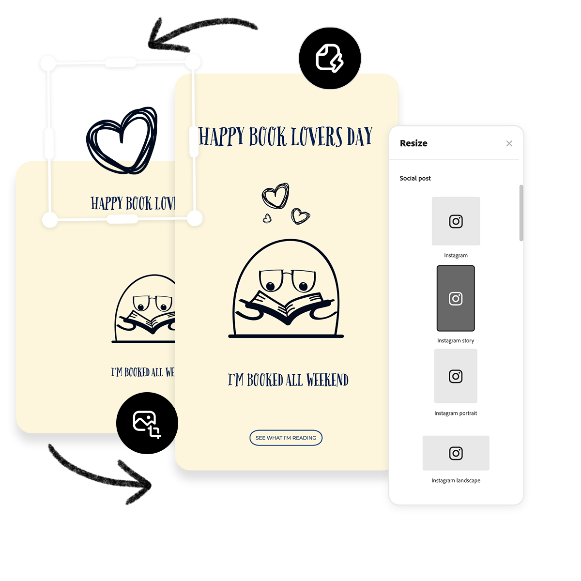 Explore modelos criados por profissionais ou crie seu pôster para a feira do livro do zero. Defina um tema usando fotos, ícones, logotipos, fontes e outros elementos personalizáveis. Duplique designs e redimensione-os para criar consistência entre vários tipos de ativos. Com o Adobe Express, é fácil e gratuito criar designs em poucos minutos.