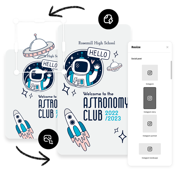 O Adobe Express inspira você a pensar de maneira ousada quando se trata de iniciar seu próximo projeto. Faça seu cartaz escolar com o Adobe Express e, em seguida, redimensione seu design para transformá-lo em conteúdo para redes sociais, boletim escolar, apostilas, banners e muito mais. Existem inúmeras oportunidades para transformar um projeto criativo em um design inesquecível.