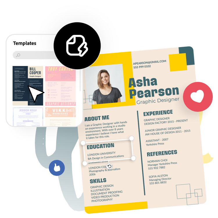 Deixe o Adobe Express ser seu especialista na criação de currículo de designer gráfico.