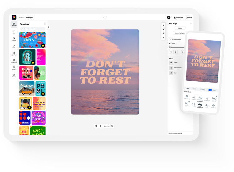 Baixe o app Adobe Express para dispositivos móveis na App Store ou Google Play e crie conteúdo para rede social onde você estiver. Seu trabalho fica sincronizado com o computador e o celular para que você possa continuar de onde parou. Com acesso ao Adobe Express quando e onde você estiver, nunca foi tão fácil criar conteúdo em trânsito.