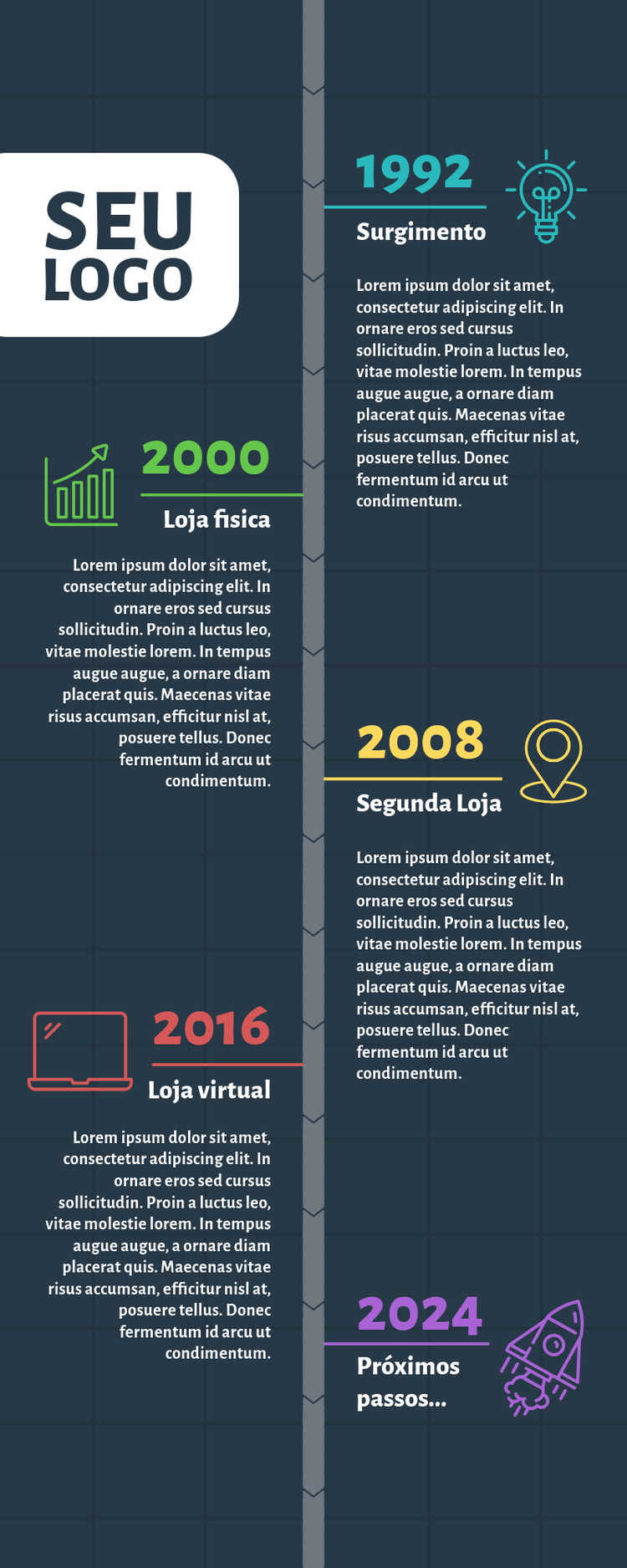 Controle os dias, semanas, meses e muito mais com o editor online grátis de linha do tempo. Seja para criar um infográfico histórico ou definir metas para o seu negócio, o Adobe tem todas as ferramentas para criar uma linha do tempo informativa e que via chamar a atenção. Comece escolhendo um dos modelos gratuitos de linha do tempo. Arraste e solte ícones, gráficos de torta, linhas e muito mais ao seu design. Impressione as pessoas com detalhes como efeitos animados na sua linha do tempo que você insere com um clique. Qualquer pessoa consegue fazer uma linha do tempo bonita em minutos, mesmo sem experiência em design.
