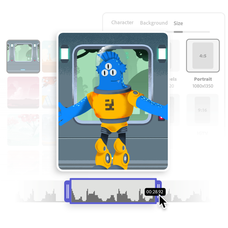 Quer mudar alguma coisa? Dá para trocar o personagem, ajustar o fundo ou até mexer na duração do vídeo usando as barras de controle. Tudo para deixar sua animação do jeitinho que você imaginou. O Adobe Express é perfeito para quem quer criar animação para YouTube sem complicação.