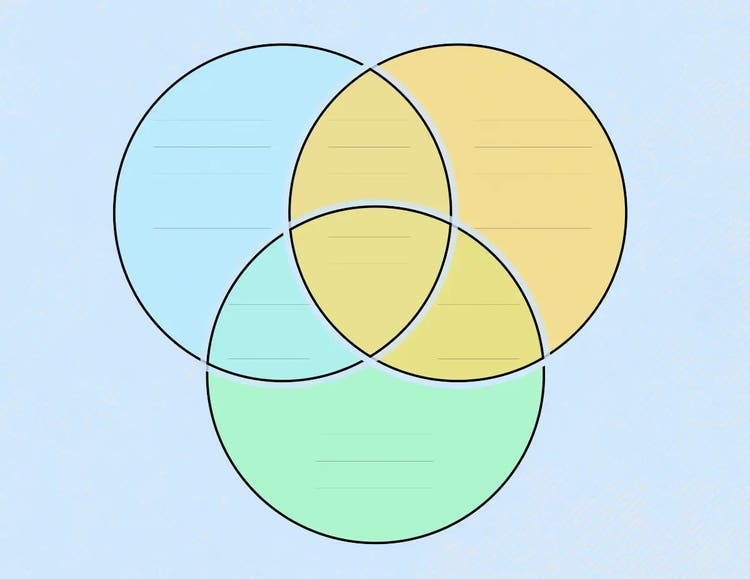 Use um diagrama de Venn em planejamento de conteúdo, design de UX ou sessões de estratégia digital para classificar informações complexas em categorias.