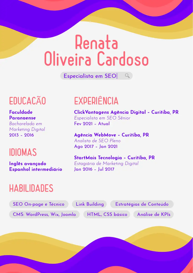 O visual do currículo também comunica muito sobre você. Um bom design transmite profissionalismo, organização e cuidado com os detalhes – qualidades que são valorizadas em qualquer área. Para escolher o design ideal, é importante levar em conta o seu perfil e o tipo da vaga. Para áreas mais formais, como jurídico ou financeiro, modelos mais discretos e tradicionais funcionam bem. Já em áreas criativas, como design, marketing ou audiovisual, você pode ousar mais no layout, nas cores e nos elementos gráficos. Independente do estilo, o importante é garantir que a leitura esteja fácil. Evite usar fontes muito decoradas ou layouts carregados de informações visuais. O foco deve ser sempre no conteúdo. E se quiser criar uma versão complementar do seu currículo para usar nas redes sociais ou no seu portfólio digital, com o criador de currículos do Adobe Express você adapta o seu documento a todos os formatos – tudo de forma prática, gratuita e intuitiva. Com um currículo bem estruturado, claro e com um visual profissional, você já está um passo à frente na busca por uma nova oportunidade de trabalho. Pronto para criar o seu? O Adobe Express te ajuda.