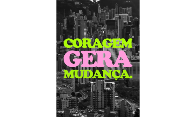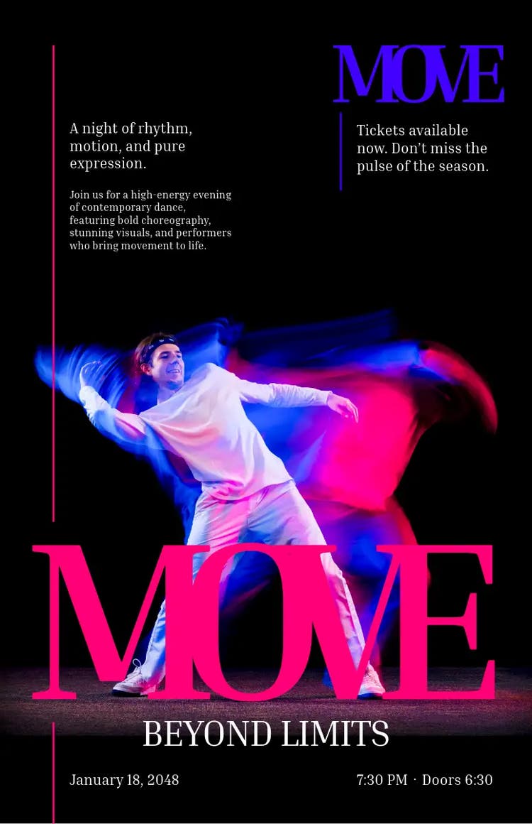 Este design do cartaz é, sem dúvida, visualmente atraente. Uma fotografia marcante com linhas e cores dinâmicas que chamam a atenção. Em última análise, o que torna este design completo é a forma como o texto é incluído na foto. Pense sobre a relação entre as imagens e os estilos de texto ao elaborar sua próxima foto para proporcionar uma experiência visual completa e coesa.