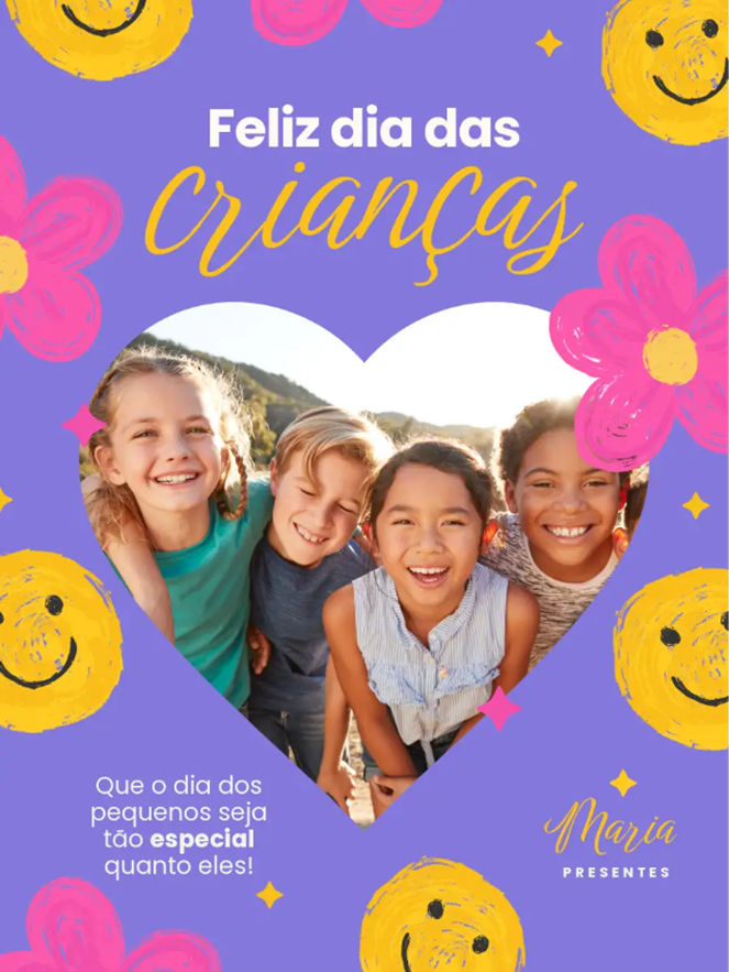 As frases curtas têm um poder incrível porque são diretas e fáceis de lembrar. No Dia das Crianças, esse tipo de mensagem pode brilhar em um cartão que acompanha um presente ou em uma postagem nas redes sociais, duas coisas que você pode criar com facilidade e gratuitamente com o Adobe Express, sem precisar de experiência em design. Algumas frases possíveis são: