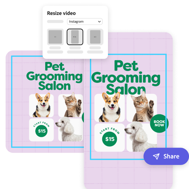 Pronto? Compartilhe em seus canais de redes sociais favoritos diretamente da plataforma do Adobe Express ou baixe seu design para publicar mais tarde.
