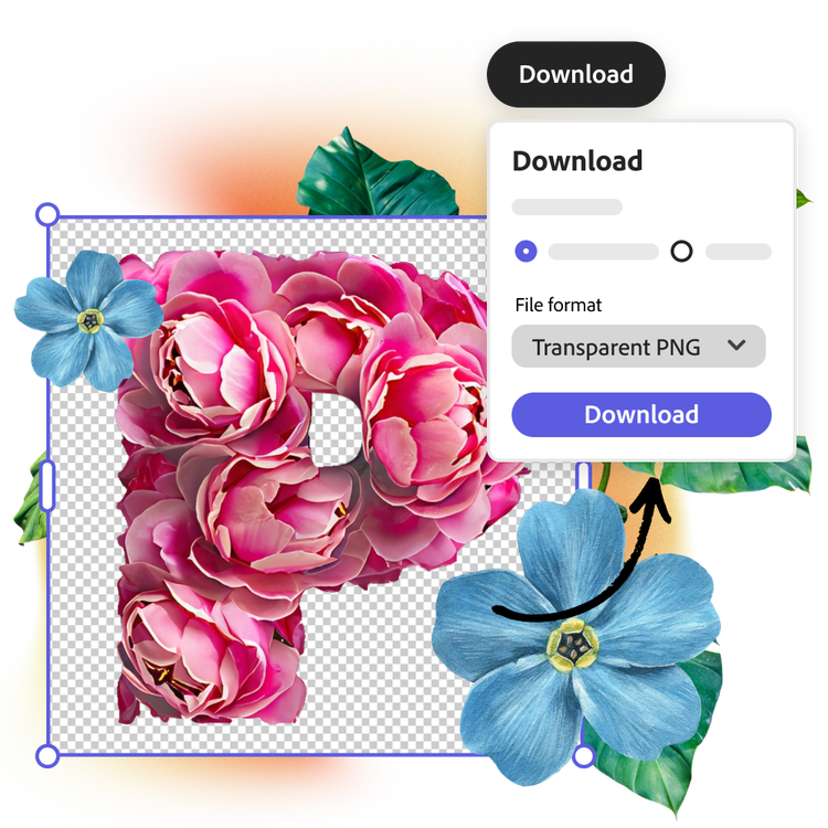 Gere efeitos de texto para passar da ideia ao design final com muito mais rapidez. Desde estilos de fonte dourados até monogramas feitos de pétalas de flores, nossa IA generativa permite criar o que você imaginar. Salve sua criação como JPEG com fundo colorido ou transparente para usar em qualquer lugar.