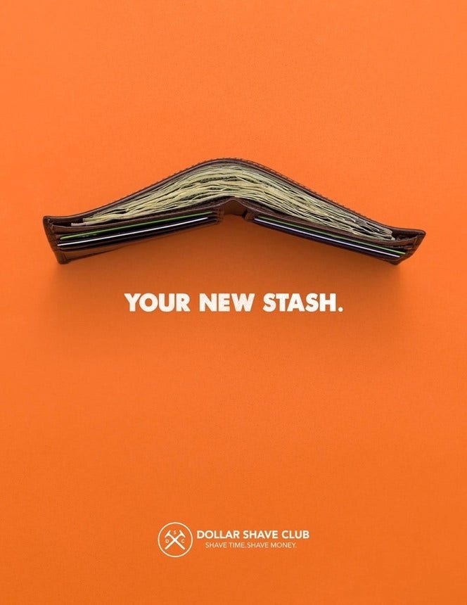 - O Dollar Shave Club aproveita a tendência de humor baseada em bigodes dos anos 2010 com esta imagem, que troca um "belo bigode" pelo dinheiro da sua carteira.