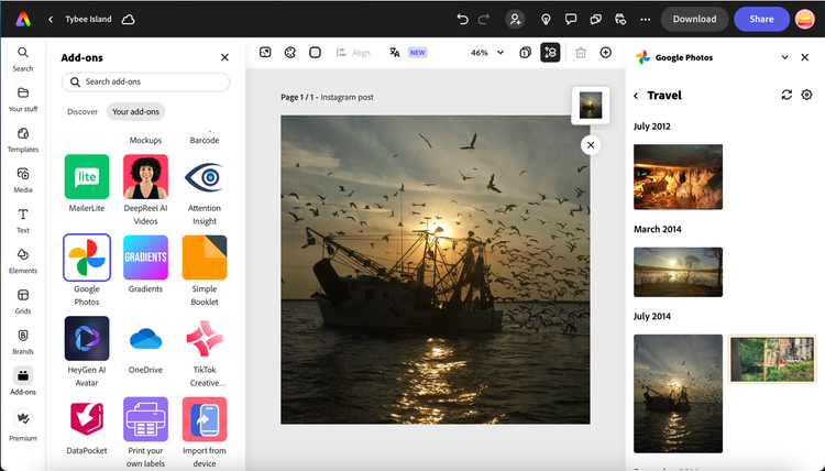 Explore nossa incrível coleção de complementos no Adobe Express aqui. No momento, os complementos estão disponíveis somente na versão para desktop, mas serão oferecidos para dispositivos móveis em breve.