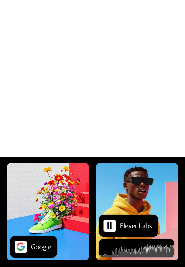 Gere com os principais modelos de IA da Adobe, do Google, da OpenAI, do ElevenLabs e muito mais.