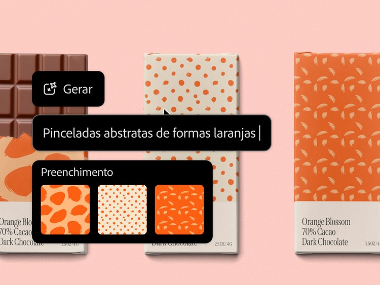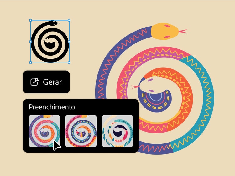Impulsione a criatividade e acelere os fluxos de trabalho com a IA generativa no Illustrator. Crie gráficos vetoriais de qualidade profissional no estilo que quiser, gere padrões perfeitos e adicione detalhes a logotipos em tempo recorde.