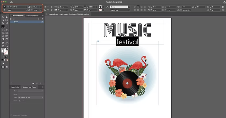 Then finish adding your text — this is a good place for event and promotional details and product descriptions. Choose the Type tool again and drag to create a second text box on top of the new colored rectangle. Enter the rest of your text and format it. Play with the text size so your headline and body text have a clear visual hierarchy, with the headline as the most prominent element.