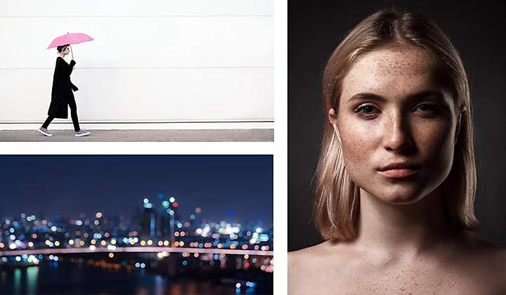 Collage of three photos: A person walking, portrait of a person, and cityscape at night