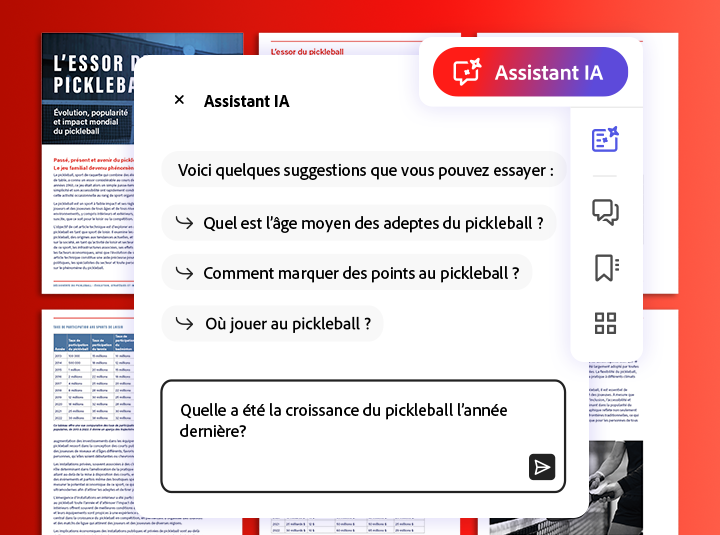 Découvrez l'Assistant IA d'Acrobat. Posez des questions à votre document et obtenez des synthèses d'un simple clic pour bénéficier d'insights en un clin d'œil et booster votre productivité. Ajoutez l'Assistant IA d'Acrobat. PRICE - ABM - AI Assistant for Acrobat {{small-tax-incl-label}} pour une {{annual-paid-monthly-plan}}.