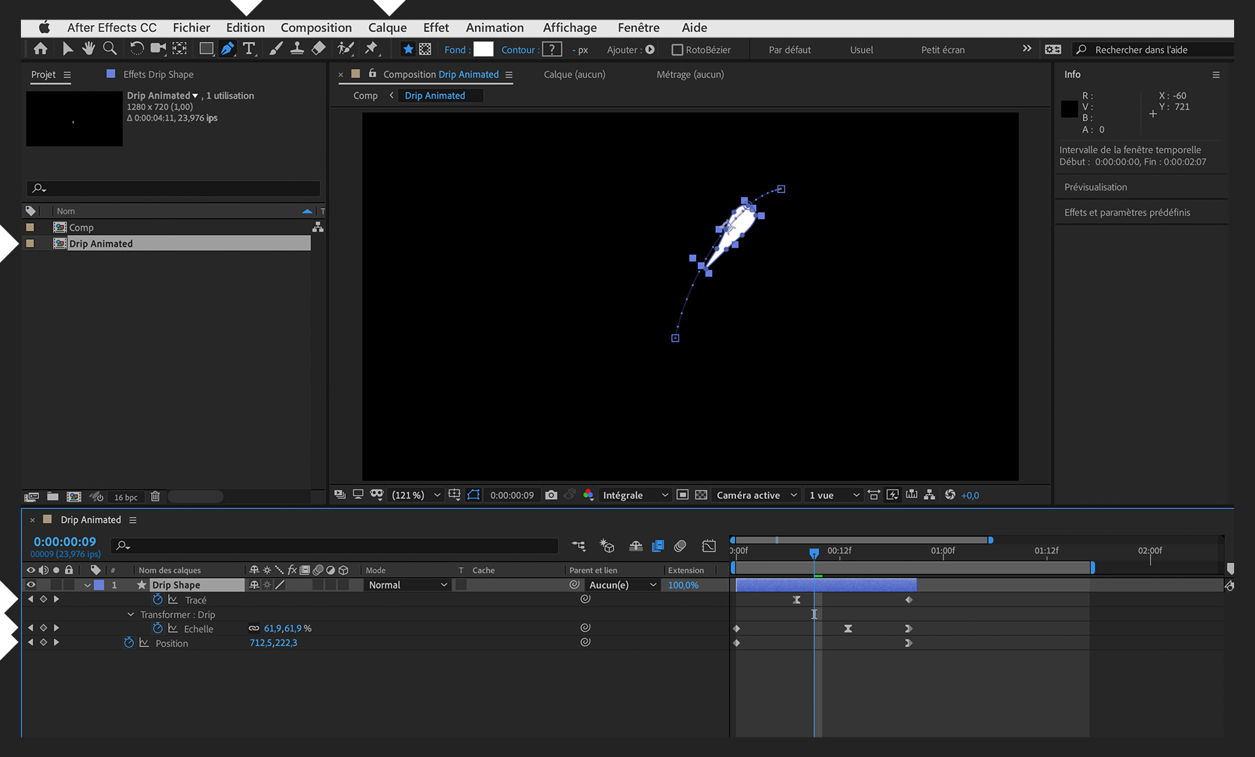 Dans une composition vierge, choisissez Calque > Nouveau > Calque de forme, puis sélectionnez l’outil Plume. Tracez une forme simple en veillant à ce que le point d’ancrage reste approximativement au centre. (Notre exemple montre une forme en goutte.) Définissez des images clés pour les variables Position et Tracé afin de déplacer la forme. Pensez également à transformer l’aspect de la forme en repositionnant ses points sur différentes images clés, mais aussi à modifier la variable Échelle. Sélectionnez une image clé et appuyez sur F9 pour lui appliquer un lissage de vitesse. Choisissez Calque > Précomposition et nommez la précomposition (la nôtre s’appelle Drip Animated). Vous pourrez ainsi l’itérer plus facilement. Lancez la lecture de l’animation et regardez la forme bouger et se transformer.