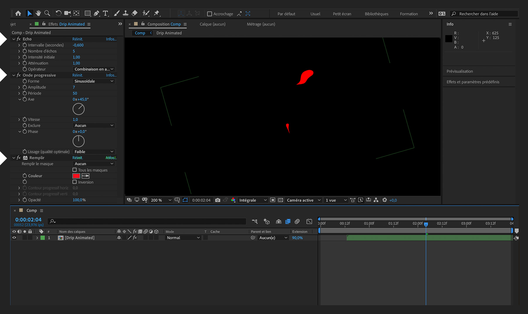 Dans votre composition principale (pas la précomposition), sélectionnez le calque de précomposition et choisissez Effet > Temps > Écho pour répéter la forme encore et encore. Après avoir défini Opérateur sur Combinaison en avant, ajustez les valeurs Intervalle (secondes) et Nombre d’échos. Dès qu’une forme atteint l’extrémité du tracé, une ou plusieurs autres apparaissent derrière elle. Déformez maintenant la forme en choisissant Animation > Distorsion > Onde progressive. Conservez les valeurs par défaut ou modifiez légèrement les valeurs Amplitude, Période et Axe. Enfin, ajoutez un effet Fond (Effet > Génération > Fond) et conservez la couleur par défaut pour l’instant.