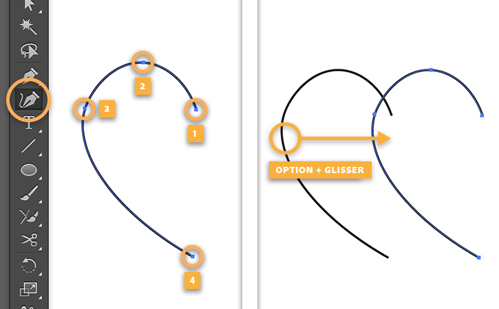 Sélectionnez l’outil Courbure et cliquez à quatre endroits différents sur le plan de travail pour créer le côté gauche du cœur. Une fois le quatrième clic effectué, appuyez sur la touche Échap pour finaliser le tracé.
