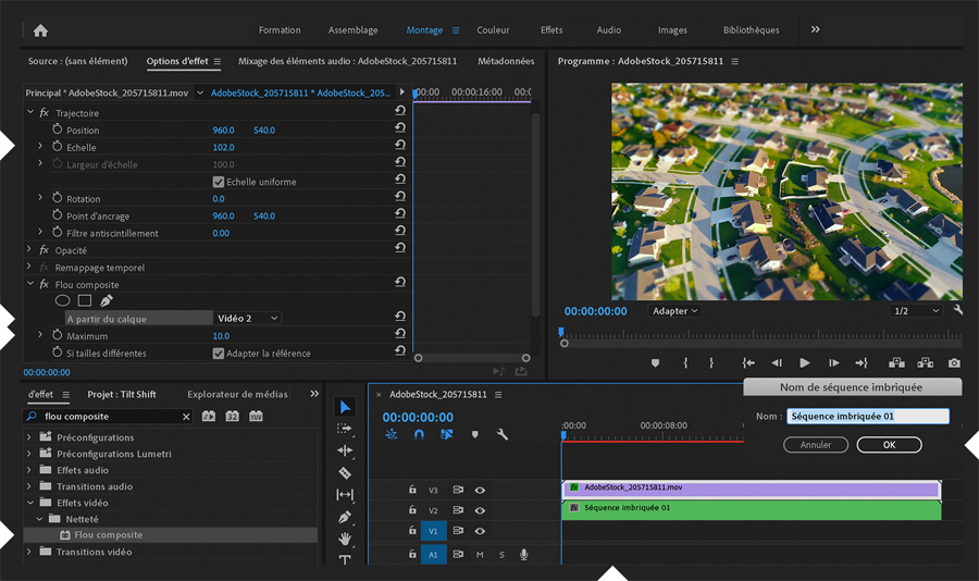 Faites un clic droit sur le cache couleur et sélectionnez Imbriquer. Acceptez le nom de la séquence imbriquée par défaut et cliquez sur OK. Faites glisser votre métrage sur la piste au-dessus de la séquence imbriquée, désormais vert. Ouvrez le panneau Effets (Maj + 7) et appliquez l’effet Flou composite au métrage. Dans le panneau Options d’effet, définissez le calque Flou de manière à ce qu’il cible la séquence imbriquée juste en dessous (probablement V2). Réduisez de moitié la valeur de flou maximal par défaut, en fonction de votre scène. Dans la section Trajectoire, augmentez légèrement la valeur d’échelle (102 %) pour que la couleur du masque d’opacité n’apparaisse pas sur les bords.