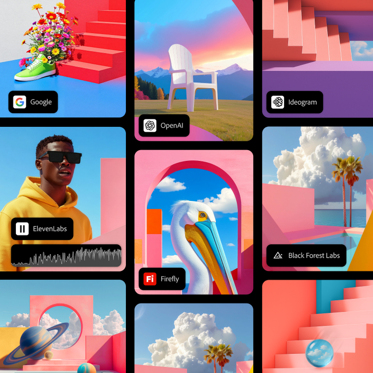 Create images, videos, audio, and design with AI models from Adobe, Google, OpenAI, and more.